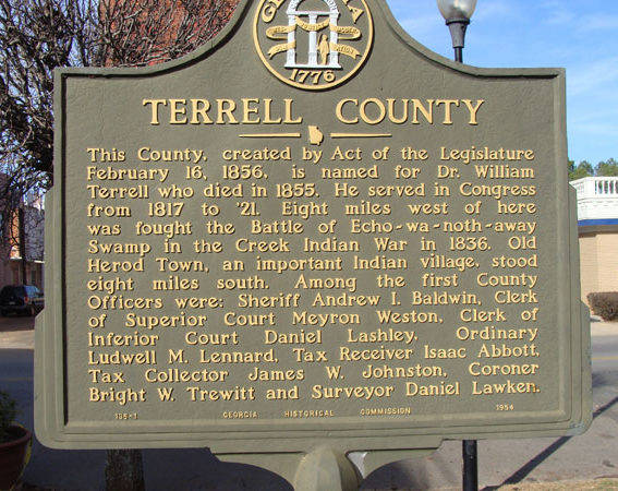 Formed by an act of the Georgia General Assembly on February 16, 1856, from portions of Randolph and Lee counties, Terrell County is named for Dr. William Terrell (1778–1855) of Sparta, Georgia, who served in the Georgia General Assembly and the United States House of Representatives. During the American Civil War, after Atlanta's capture by Union forces, a refugee settlement was established in Terrell County for civilians forced to flee the city. The Fosterville settlement, named after Georgia Quartermaster General Ira Roe Foster, was the "most ambitious refugee project approved by the Georgia General Assembly [during that period]" according to author Mary Elizabeth Massey in her 2001 history. On March 11, 1865, the Georgia General Assembly authorized General Foster to "continue to provide for maintenance of said exiles, or such of them as are unable by their labor to support themselves, or their families for the balance of the present year." The western and southern two-thirds of Terrell County is located in the Ichawaynochaway Creek sub-basin of the ACF River Basin (Apalachicola-Chattahoochee-Flint River Basin). The county's northeastern third is located in the Kinchafoonee-Muckalee sub-basin of the same larger ACF River Basin..